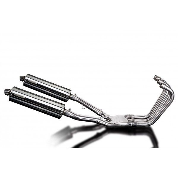 De Oval demper van Delkevic is gemaakt van RVS. De lengte van de demper is 450mm. De uitlaatbochten zijn gemaakt van RVS.