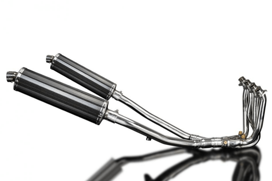 De Oval demper van Delkevic is gemaakt van Carbon. De lengte van de demper is 450mm. De uitlaatbochten zijn gemaakt van RVS.