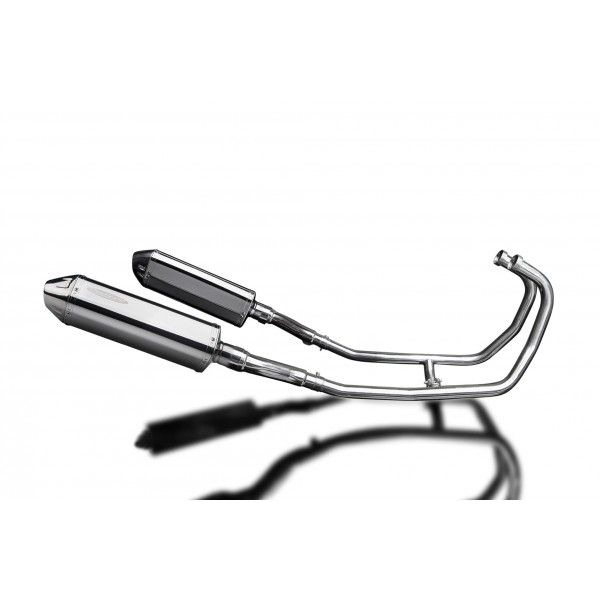 De Tri-Oval demper van Delkevic is gemaakt van RVS. De lengte van de demper is 320mm. De uitlaatbochten zijn gemaakt van RVS.