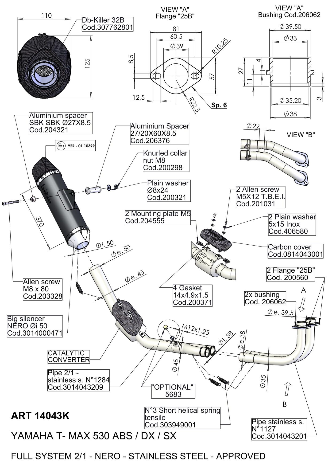Leovince 14043K SBK volledig uitlaatsysteem NERO 2/1 YAMAHA TMAX ABS/DX/ SX RVS met katalysator type Volledig systeem