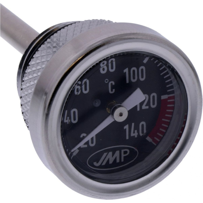 JMP-olietemperatuurmeter met analoog display. Vooral op hete dagen in de zomer of in het buitenland kan je wel eens twijfelen over de temperatuur van je motor. Op deze meter kan je eenvoudig aflezen of de temperatuur normaal is, zoals bij dagelijks gebruik, of veel hoger. Als je olietemperatuurmeter onder normale omstandigheden 80 graden aanwijst, en op een hete dag staat hij op 120 graden, dan weet je dat je beter even kunt stoppen. Teflon-gemonteerde versie in een nieuw ontwerp. De originele olievulplug moet worden vervangen door deze olietemperatuurmeter. De temperatuur van de rondspattende olie die op de meetsonde terecht komt wordt gemeten. De meetsonde hangt bij de meeste motoren meestal niet in het oliebad.
