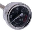 JMP-olietemperatuurmeter met analoog display. Vooral op hete dagen in de zomer of in het buitenland kan je wel eens twijfelen over de temperatuur van je motor. Op deze meter kan je eenvoudig aflezen of de temperatuur normaal is, zoals bij dagelijks gebruik, of veel hoger. Als je olietemperatuurmeter onder normale omstandigheden 80 graden aanwijst, en op een hete dag staat hij op 120 graden, dan weet je dat je beter even kunt stoppen. Teflon-gemonteerde versie in een nieuw ontwerp. De originele olievulplug moet worden vervangen door deze olietemperatuurmeter. De temperatuur van de rondspattende olie die op de meetsonde terecht komt wordt gemeten. De meetsonde hangt bij de meeste motoren meestal niet in het oliebad.