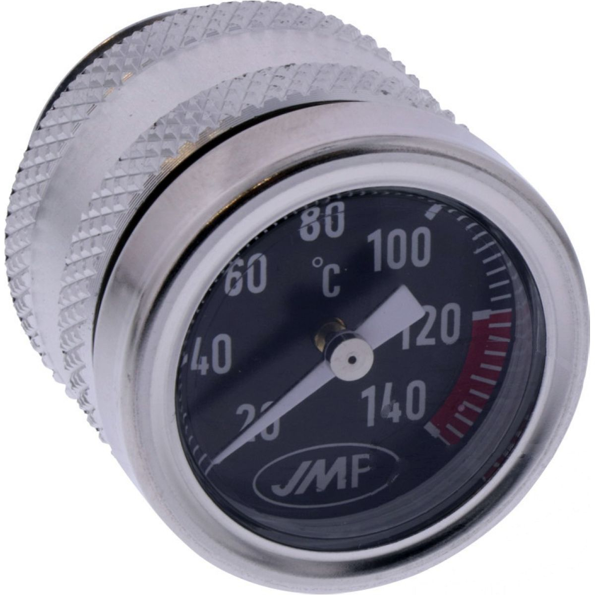 JMP-olietemperatuurmeter met analoog display. Vooral op hete dagen in de zomer of in het buitenland kan je wel eens twijfelen over de temperatuur van je motor. Op deze meter kan je eenvoudig aflezen of de temperatuur normaal is, zoals bij dagelijks gebruik, of veel hoger. Als je olietemperatuurmeter onder normale omstandigheden 80 graden aanwijst, en op een hete dag staat hij op 120 graden, dan weet je dat je beter even kunt stoppen. Teflon-gemonteerde versie in een nieuw ontwerp. De originele olievulplug moet worden vervangen door deze olietemperatuurmeter. De temperatuur van de rondspattende olie die op de meetsonde terecht komt wordt gemeten. De meetsonde hangt bij de meeste motoren meestal niet in het oliebad.