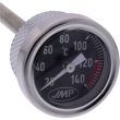 JMP-olietemperatuurmeter met analoog display. Vooral op hete dagen in de zomer of in het buitenland kan je wel eens twijfelen over de temperatuur van je motor. Op deze meter kan je eenvoudig aflezen of de temperatuur normaal is, zoals bij dagelijks gebruik, of veel hoger. Als je olietemperatuurmeter onder normale omstandigheden 80 graden aanwijst, en op een hete dag staat hij op 120 graden, dan weet je dat je beter even kunt stoppen. Teflon-gemonteerde versie in een nieuw ontwerp. De originele olievulplug moet worden vervangen door deze olietemperatuurmeter. De temperatuur van de rondspattende olie die op de meetsonde terecht komt wordt gemeten. De meetsonde hangt bij de meeste motoren meestal niet in het oliebad.