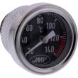 JMP-olietemperatuurmeter met analoog display. Vooral op hete dagen in de zomer of in het buitenland kan je wel eens twijfelen over de temperatuur van je motor. Op deze meter kan je eenvoudig aflezen of de temperatuur normaal is, zoals bij dagelijks gebruik, of veel hoger. Als je olietemperatuurmeter onder normale omstandigheden 80 graden aanwijst, en op een hete dag staat hij op 120 graden, dan weet je dat je beter even kunt stoppen. Teflon-gemonteerde versie in een nieuw ontwerp. De originele olievulplug moet worden vervangen door deze olietemperatuurmeter. De temperatuur van de rondspattende olie die op de meetsonde terecht komt wordt gemeten. De meetsonde hangt bij de meeste motoren meestal niet in het oliebad.