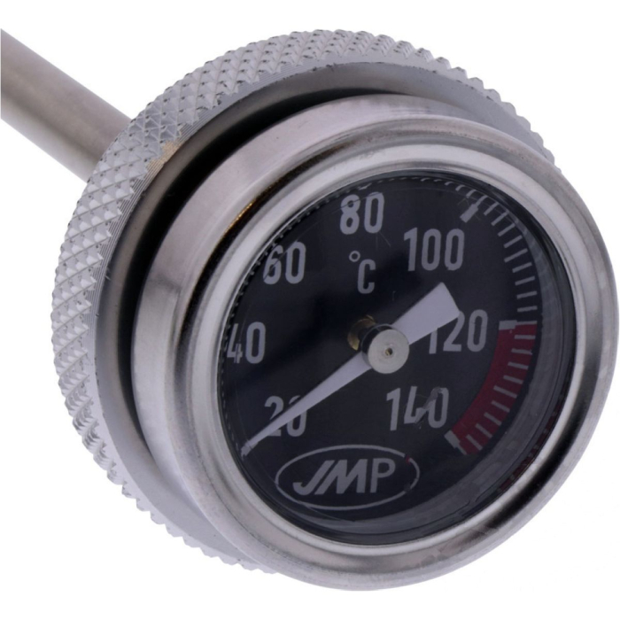 JMP-olietemperatuurmeter met analoog display. Vooral op hete dagen in de zomer of in het buitenland kan je wel eens twijfelen over de temperatuur van je motor. Op deze meter kan je eenvoudig aflezen of de temperatuur normaal is, zoals bij dagelijks gebruik, of veel hoger. Als je olietemperatuurmeter onder normale omstandigheden 80 graden aanwijst, en op een hete dag staat hij op 120 graden, dan weet je dat je beter even kunt stoppen. Teflon-gemonteerde versie in een nieuw ontwerp. De originele olievulplug moet worden vervangen door deze olietemperatuurmeter. De temperatuur van de rondspattende olie die op de meetsonde terecht komt wordt gemeten. De meetsonde hangt bij de meeste motoren meestal niet in het oliebad.