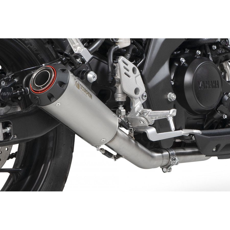 Scorpion Red Power titanium demper, volledige uitlaat Yamaha XSR 125 vanaf 2021, 2022 en opvolgende, gelijkwaardige modeljaren. Deze uitlaat is een volledig systeem, dus inclusief de uitlaatbochten. De demper is gemaakt van geborsteld RVS.