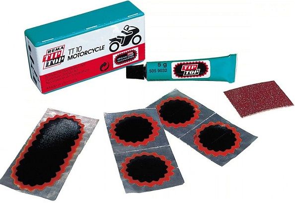 Tip Top Bandenreparatie Assortiment TT 10 / 506 0203. Tweewielig assortiment voor binnenbanden van bromfietsen en motorfietsen. In een plastic doos.