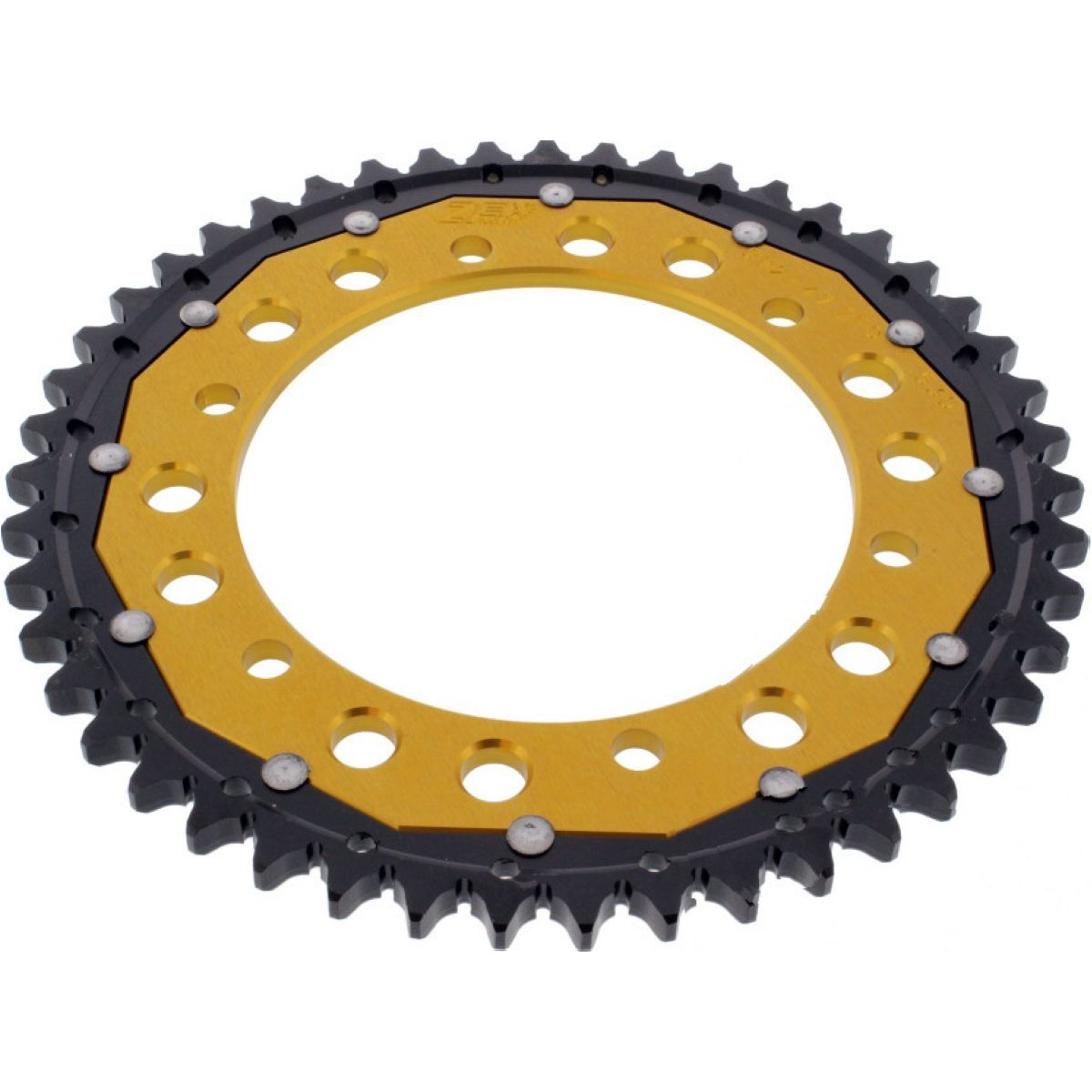 De ZF dubbele tandwielen behoren tot de hoogste kwaliteit en technisch meest geavanceerde tandwielen ter wereld. Het geheim is gebaseerd op de combinatie van de duurzaamheid van staal en de lichtheid van duraluminium. Deze aluminiumlegering wordt gekenmerkt door zijn enorme sterkte en dichtheid en door zijn lage gewicht. De treksterkte is ongeveer 11 keer die van puur aluminium. Bij uitharding wordt duraluminium bijna net zo sterk als staal. Dienovereenkomstig zijn een lager gewicht en een grotere duurzaamheid geïmplementeerd. Frezen in de tandbasis van het tandwiel garanderen een optimale zelfreiniging. Deze uitsparingen zorgen ervoor dat het vuil zich niet tussen de tanden kan nestelen en dat de ketting en het tandwiel minder snel slijten. De duurzaamheid van de ZF-Dual tandwielen is ongeveer drie keer langer dan die van puur aluminium tandwielen en zijn 50% lichter dan stalen tandwielen. Uitermate geschikt voor op de weg en offroad.