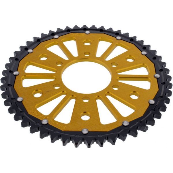 De ZF dubbele tandwielen behoren tot de hoogste kwaliteit en technisch meest geavanceerde tandwielen ter wereld. Het geheim is gebaseerd op de combinatie van de duurzaamheid van staal en de lichtheid van duraluminium. Deze aluminiumlegering wordt gekenmerkt door zijn enorme sterkte en dichtheid en door zijn lage gewicht. De treksterkte is ongeveer 11 keer die van puur aluminium. Bij uitharding wordt duraluminium bijna net zo sterk als staal. Dienovereenkomstig zijn een lager gewicht en een grotere duurzaamheid geïmplementeerd. Frezen in de tandbasis van het tandwiel garanderen een optimale zelfreiniging. Deze uitsparingen zorgen ervoor dat het vuil zich niet tussen de tanden kan nestelen en dat de ketting en het tandwiel minder snel slijten. De duurzaamheid van de ZF-Dual tandwielen is ongeveer drie keer langer dan die van puur aluminium tandwielen en zijn 50% lichter dan stalen tandwielen. Uitermate geschikt voor op de weg en offroad.